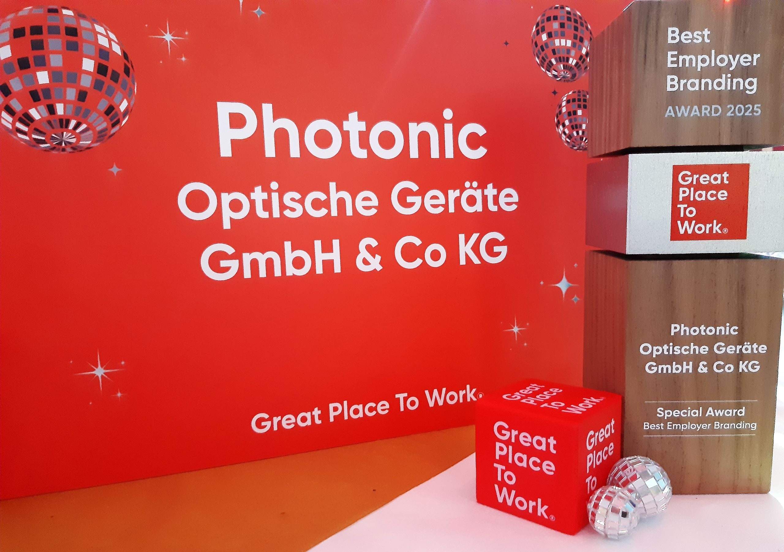 Double award for PHOTONIC at the Great Place to Work® For All™ Stars Night 19. May 2025 For the second year in a row, the lighting specialist is ranked among the Top 10 Best Workplaces™ in Austria. In addition, PHOTONIC was one of only five companies to receive the Best Employer Branding Award 2025 for particularly effective and authentic initiatives to enhance employer attractiveness. “The fact that we are among the Top 10 employers in the category XS for the second year in a row and have now also been honored with the Best Employer Branding Award makes me incredibly proud,” emphasizes PHOTONIC Managing Director Stefan Zotter. “It shows that we are not only on the right path internally but also present ourselves convincingly as an employer brand. We place great importance on ensuring that everyone feels valued here – this builds trust, unity, and motivation.” The award is proof that the entire PHOTONIC team lives a strong corporate culture. The prize is based on an anonymous employee survey that covers five dimensions: credibility, respect, fairness, pride, and team spirit. Once again this year, PHOTONIC received particularly positive ratings in all areas. For example, 97% of respondents agreed with the statements “We have fun at work” and “I believe I can make an important contribution here.” PHOTONIC’s strong team spirit is also successfully communicated externally, as evidenced by the Best Employer Branding Award 2025. Anne Killmeyer, responsible for marketing, is especially pleased about this honour: “Employer branding works best when it comes from genuine collaboration. That’s why this award is a wonderful confirmation that our communication truly brings PHOTONIC’s values to life – not just internally, but also for applicants and external partners.” PHOTONIC was represented by a strong team at the award ceremony: In addition to Martin Kiryakov (Lead Project Manager Sales and Works Council) and Christian Czech (Account Manager / Internal Sales), Ingo Wiest (Business Development), Tobias Mrachacz (SCM Launch Manager), and Anne Killmeyer (Marketing & Management Assistant) attended the event and celebrated the repeated success together. Fotocredits: © leadersnet / Gabriel Rizar & PHOTONIC